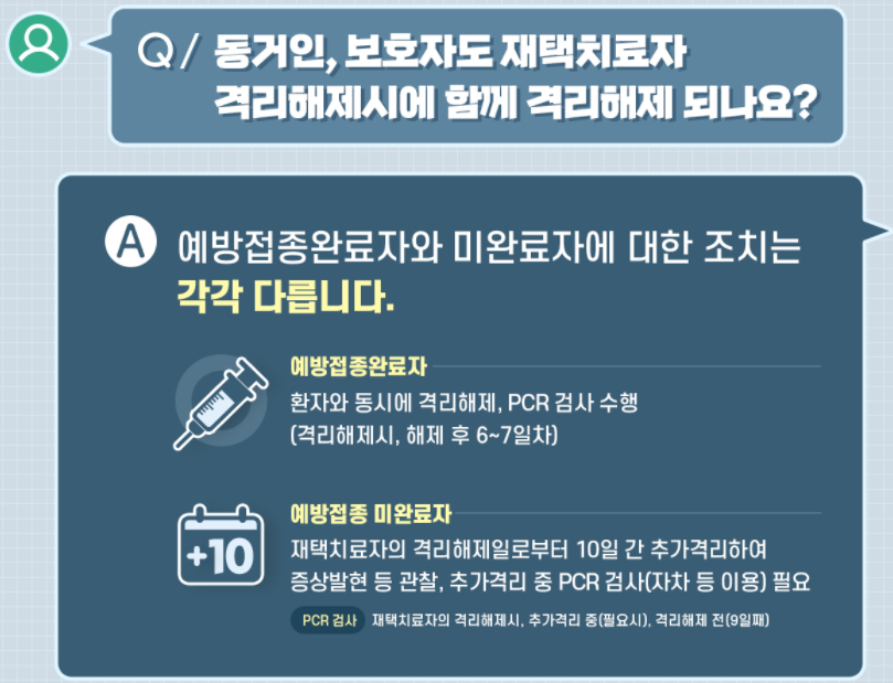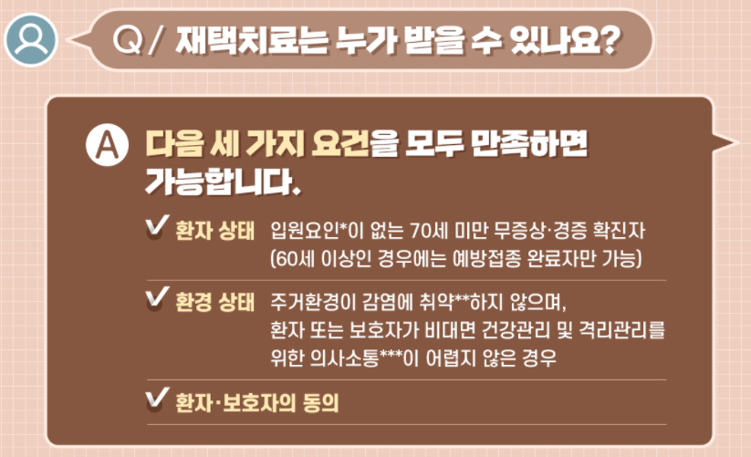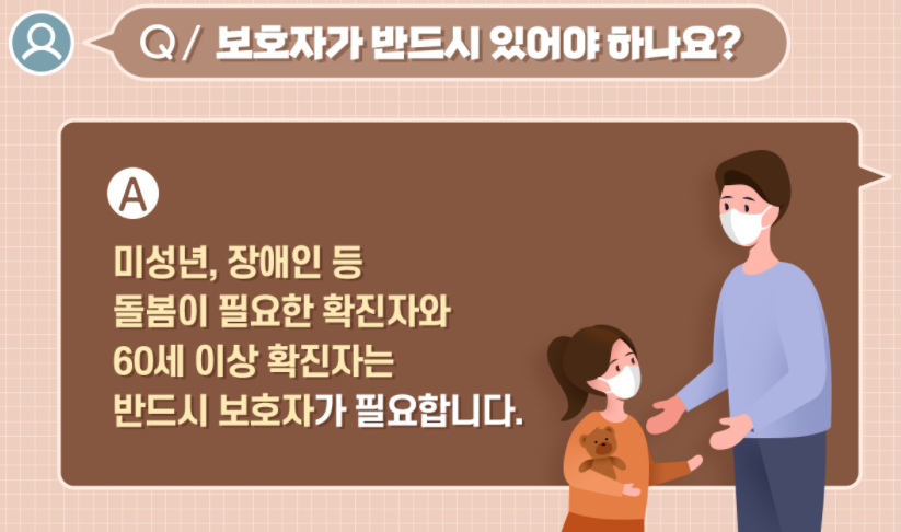 ![]() ◦ (보호자 요건) 입원요인이 없고, 건강·격리관리 지원이 가능하며, 앱(ICT) 등 활용 능통 필요, 60세 이상 확진자는 예방접종완료자인 경우 가능 |