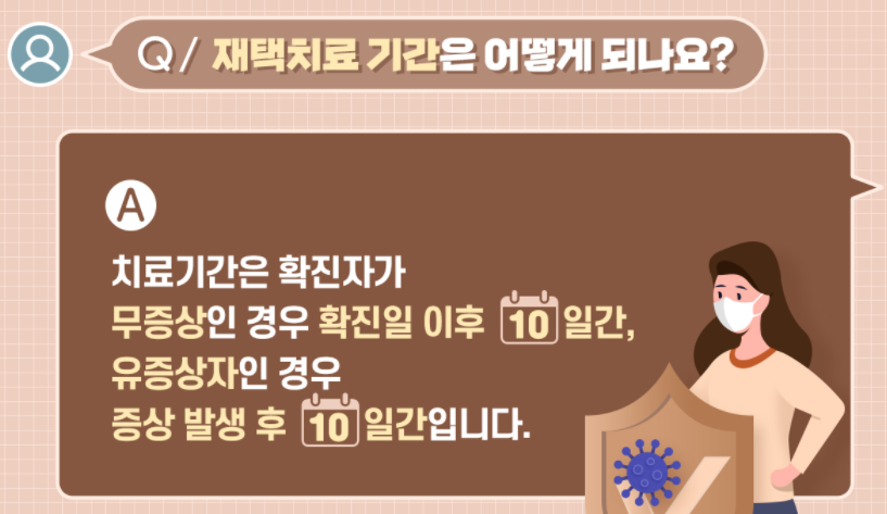 | 재택 치료란 코로나19 확진자가 감염병 예방법 제41조에 따라 환자의 상태와 여건 등을 고려 격리 기간을 집에서 보내는 것을 말합니다. | 환자나 보호자, 동거인 모두 재택치료 기간 중 외출은 불가능합니다. ① 외출금지 ② 집안 내 항상 마스크 착용 및 수시 손 씻기 ③ 화장실 공동사용 불가 단, 화장실이 1개인 경우 사용 후 즉시 소독 ④ 생활용품 식기나 물컵, 수건 침구류 등은 구분해서 사용 |