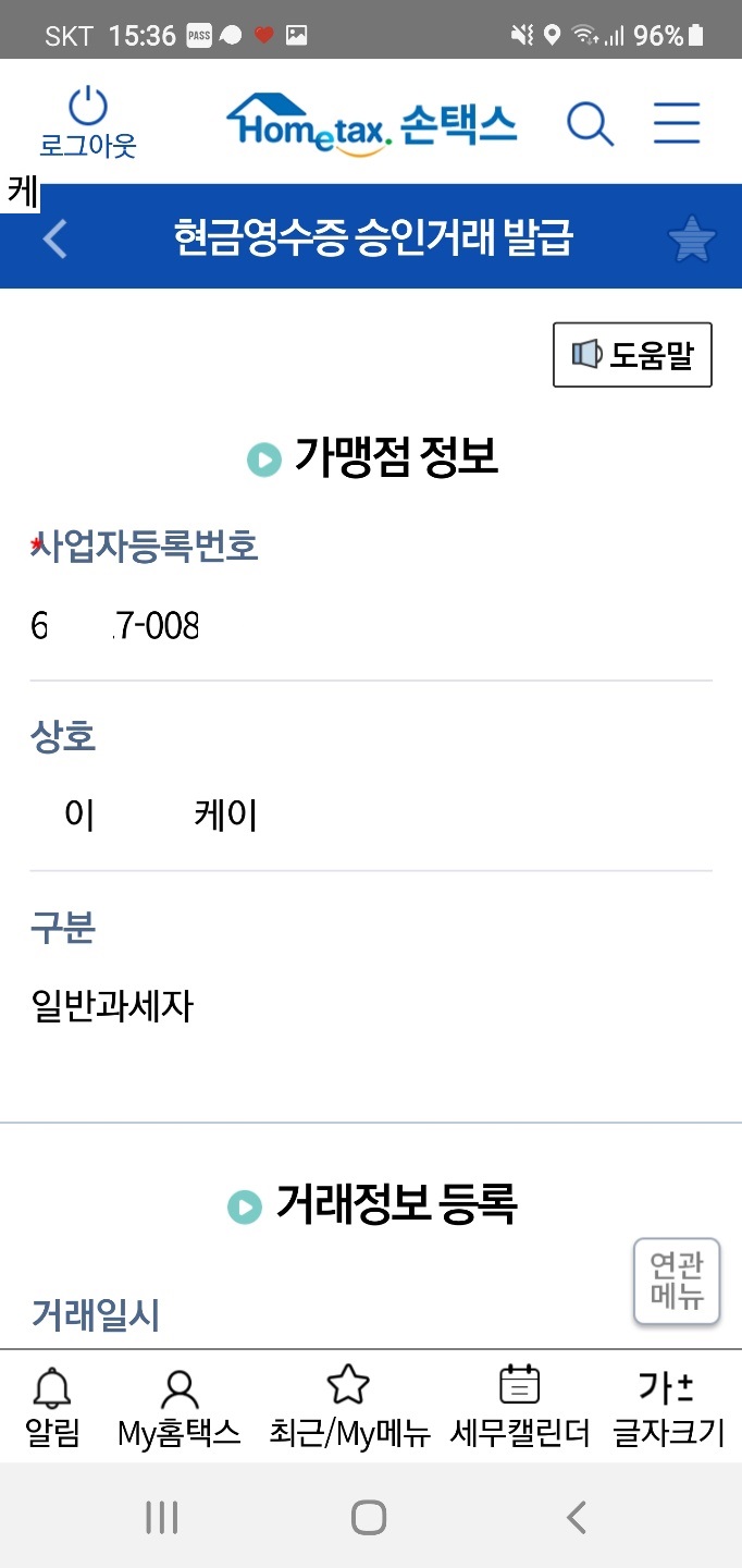 | 가맹점에서 발급시 자급발급에 " 부" 용도구분에는 (상대가 사업자일 경우, 지출증빙) 성격에 과세, 면세 구분 선택을 확인 |