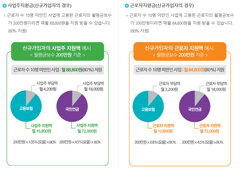 ▶ 근로자 10인 미만인 경우 월평균보수 230만원 미만인 신규근로자의 국민연금, 고용보험료의 80% 지원 (사업주 & 근로자)