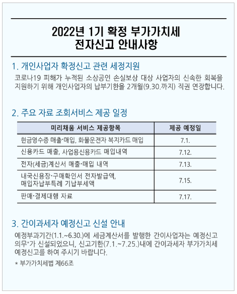 2022년 1기 확정 부가가치세 신고기간이 도래되었습니다. 7월 25일까지 신고납부를 마쳐야합니다.(직권연장 제외)