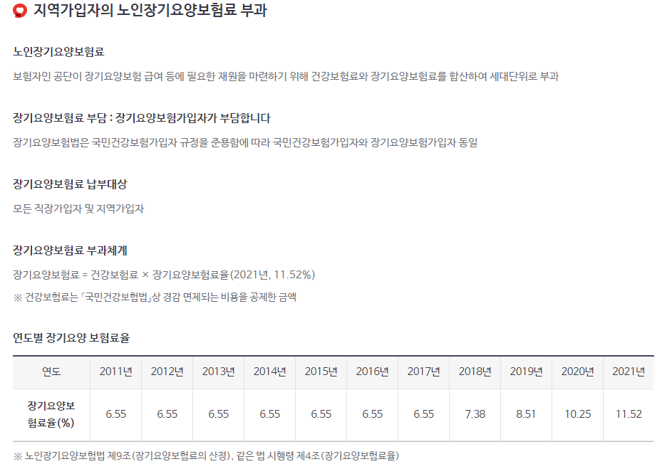 - 장기요양보험료율 : 건강보험료의 11.52%