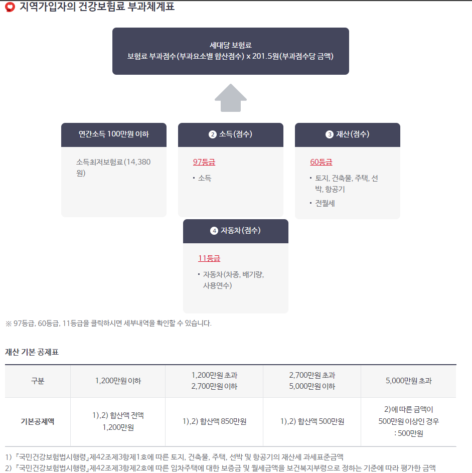 - 지역가입자의 보험료는 가입자의 소득, 재산(자동차 포함)을 참작하여 정한 부과요소별 점수를 합산한 보험료 부과점수에 점수당 금액을 곱하여 보험료 산정 후 경감률 등을 적용하여 세대단위로 부과 합니다