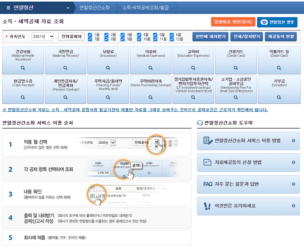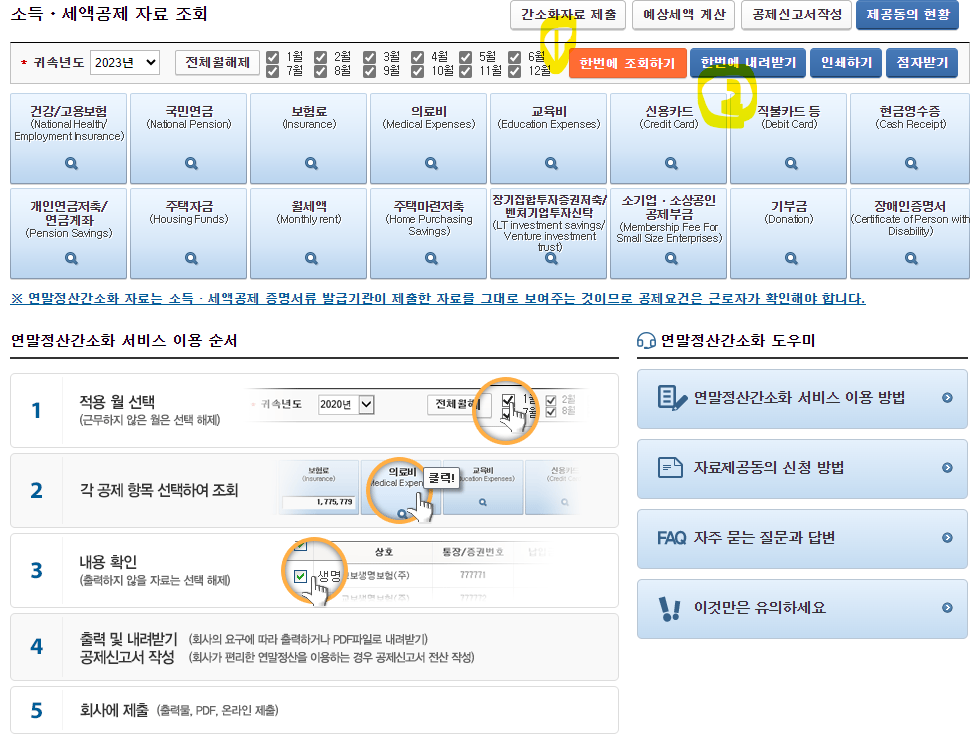 건강보험부터 기부금까지아래 항목을 모두 클릭하되, (주황색) 한번에 조회하기하면 한번에 바로 조회가 됩니다. 각 항목에 내용 및 금액을 확인합니다.