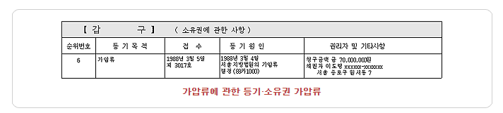 가) 소유권에 대한 압류, 가압류, 경매개시결정, 가처분 등 처분제한등기 채권자가 채권확보를 위하여 채무자의 재산을 압류, 가압류한 경우에 그 채무자(소유자)가 채무를 변제하지 못할 때에는 결국 그 부동산은 경매가 될 것이기 때문입니다. 그리고, 경매개시결정 등기란 이미 그 부동산에 경매절차가 진행되고 있음을 의미합니다. 또 그 부동산에 대한 소유권이전등기 청구권을 확보하기 위하거나 또는 말소하기 위하여 처분금지 가처분을 한 경우에는 그 소송의 원고가 승소판결을 얻는다면 가처분 이후의 모든 등기는 말소 될 가능성이 아주 많다는 것을 유의해야 합니다.