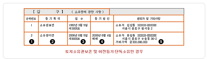 ① 순위번호 : 등기한 순서를 숫자로 표시합니다. 이 란에 기재된 순위번호에 의하여 갑구 사항란의 권리간에 우선순위가 정해집니다.
