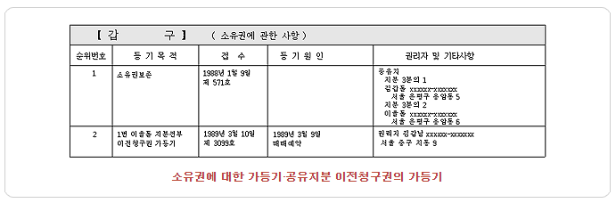 소유권에 대한 압류, 가등기, 경매개시결정 등기 그리고 소유권의 말소 또는 회복에 관한 재판이 진행 중임을 예고하는 예고등기, 소유자의 처분을 금지하는 가처분등기 등이 모두 갑구에 기재할 사항입니다. 그리고 이러한 권리관계의 변경, 소멸에 관한 사항도 역시 갑구에 기재합니다. 소유권보존 등기는 그 부동산에 대하여 제일 먼저 하는 등기이며, 소유권이 지분으로 이전된 경우에는 2인 이상이 그 부동산을 공동으로 소유한다는 것을 의미합니다. 소유권이 이전되더라도 전 소유자란은 주말하지 않습니다. 주말하는 경우란 해당 등기가 말소되는 경우에 한합니다.