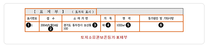 토지의 경우에는 지번, 지목, 지적을 건물인 경우에는 지번, 구조, 용도, 면적 등을기재합니다. 단, 아파트 등 집합건물인 경우에는 전체 건물(예:강남아파트 1동)에 대한 표제부와 구분된 개개의 건물(예:1동101호)에 대한 표제부가 따로 있습니다. 토지의 분할이나 지목의 변경 또는 건물 구조의 변경이나 증축 등에 의한 면적 변경도 표제부에 기재됩니다.