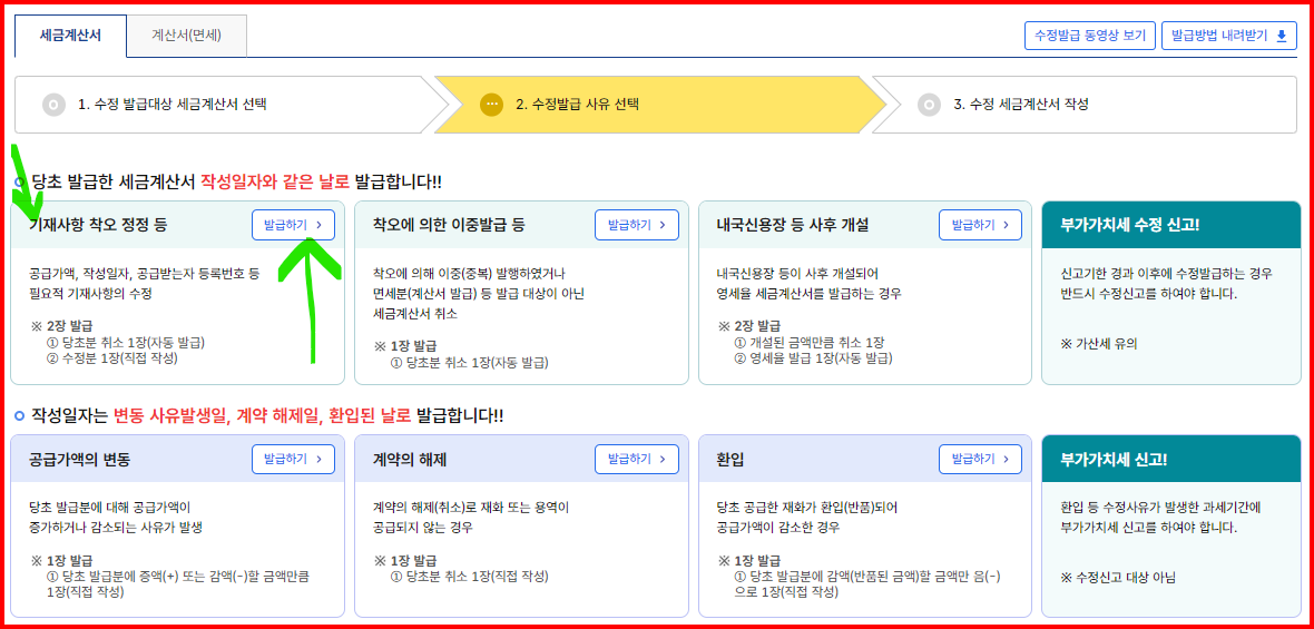 그 첫번째로 "기재사항 착오정정" 사유로 수정세금계산서 발급하는 방법입니다.
