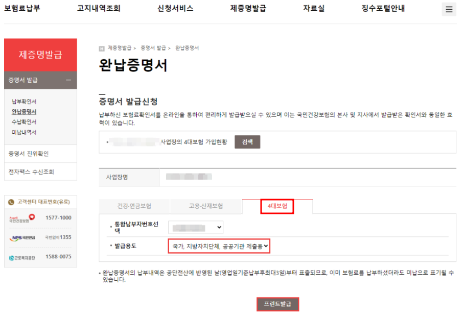 4대보험 중 단 하나라도 미납 내역이 있으면 완납증명서는 발급되지 않습니다.