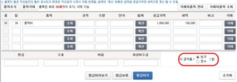 - 마지막으로 청구, 영수 중 선택하고 발급하기를 하면 발급이 완료 됩니다.