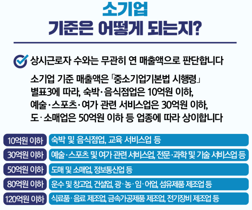 A. 소기업은 상시근로자 수와는 무관히 연 매출액으로 판단한다. 소기업 기준 매출액은 ‘중소기업기본법 시행령’ 별표3에 따라, 숙박ㆍ음식점업은 10억 원 이하, 예술ㆍ스포츠ㆍ여가 관련 서비스업은 30억 원 이하, 도ㆍ소매업과 정보통신업은 50억 원 이하, 운수 및 창고업, 건설업, 광ㆍ농ㆍ임ㆍ어업, 섬유제품 제조업은 80억 원 이하, 식료품ㆍ음료 제조업, 금속가공제품 제조업, 전기장비 제조업은 120억 원 이하 등 업종에 따라 상이하다.