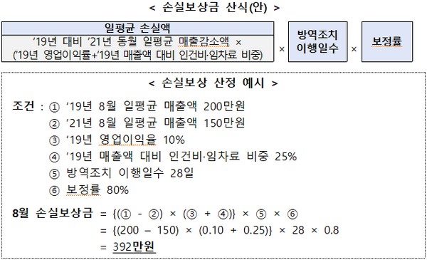 | 2019년을 기준으로 2019년 대비 올해 같은 기간 일평균 손실액을 방역 조치 이행 기간과 보정률을 적용해서 산정한다. 일평균 손실액은 영업이익률과 매출액 대비 인건비‧임차료 비중을 100% 반영한다. 다만 보정률은 집합금지와 영업시간 제한 조치 별로 차등하지 않고 일괄적으로 80%를 적용한다. 보상금 상한액은 분기당 1억원이며 하한액은 분기당 10만원이다. |