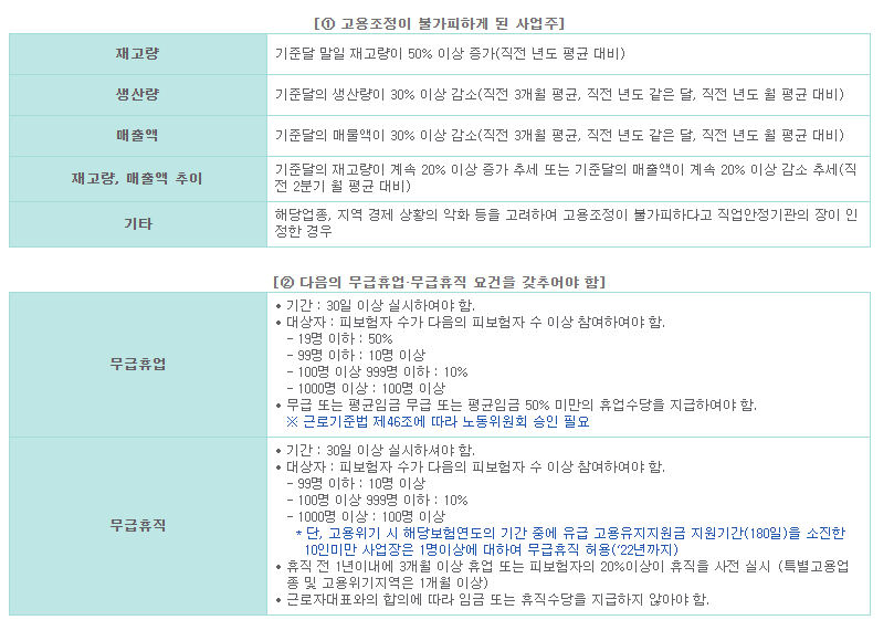 경기의 변동·산업구조의 변화 등으로 고용조정이 불가피한 사업주가 고용유지조치의 수단으로 무급의 휴업 또는 휴직을 실시하는 경우 무급휴업·휴직 기간 중 근로자에게 고용유지지원금을 지원함으로서 근로자 실직을 예방하고 생계안정 유지